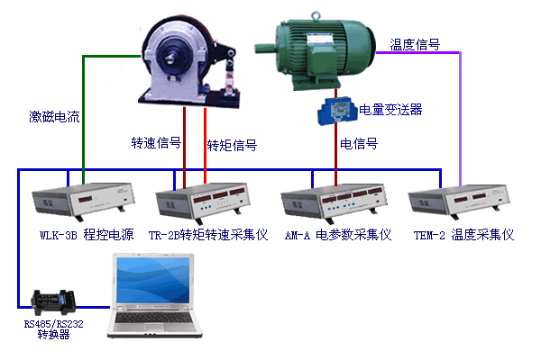 - 系統(tǒng)用1臺磁粉測功機加載,用1臺TR-2B轉(zhuǎn)矩轉(zhuǎn)速采集儀采集電機的輸出轉(zhuǎn)矩和轉(zhuǎn)速;用1臺AM-A型電參數(shù)采集儀采集電機的輸入電壓、電流、功率因數(shù)、頻率等參數(shù);用1臺TEM-2溫度采集儀采集溫升;用WLK-3B程控電源控制磁粉測功機。